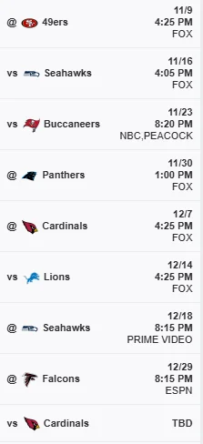 I'd say the three games I've highlighted are must wins if we want to avoid a low playoff seed. We have to beat the niners to win the division, and the other two have head-to-head tie breaker implications. At least splitting Seattle is a must. I will be ecstatic if we win the next three.
