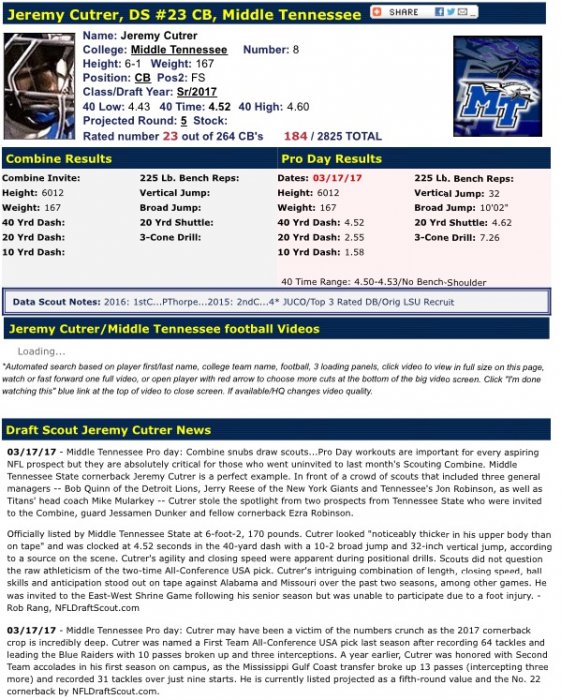 With the 202nd pick in the 2017 NFL Draft, the San Francisco Whiners select: Jeremy Cutrer, CB, Middle Tennesee State. @Mojo Ram is on the clock and has until 1318 on 15APR17 to make his selection for the Denver Broncos. @T-REX is on deck for the Tampa Bay Buccaneers.