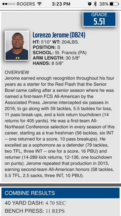 Well-defined with muscular arms and tapered waist. Wonderfully aggressive. Heat-seeking missile who looks for contact. Form tackler looking to strike, lift, and bury. Former safety with disciplined vision and above-average instincts. Can get home as blitzer. Reacts quickly to play-action screen passes and reverses. Good straight-line speed and revved motor for extended tackle range. Has some coverage ability in space. Durable two-year starter playing more than 94 percent of his team's defensive snaps. Accelerates through contact. Speed and toughness creates potential opportunities at multiple linebacker spots. Special teams demon with three blocked punts and 24 coverage tackles.