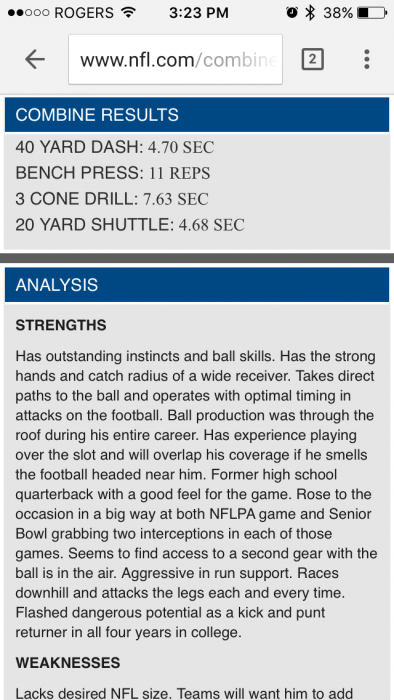 Needs to add a little more size to his frame. Can be outmuscled by size. Hand usage is inconsistent. Needs to improve in art of discarding blockers. Just average at punching and shedding to keep himself clean in take-on situations. Bad habit of ducking head into crunching tackles rather than seeing what he hits. Tightly wound with average change-of-direction talent. Can improve his path to perimeter to avoid traffic around him.