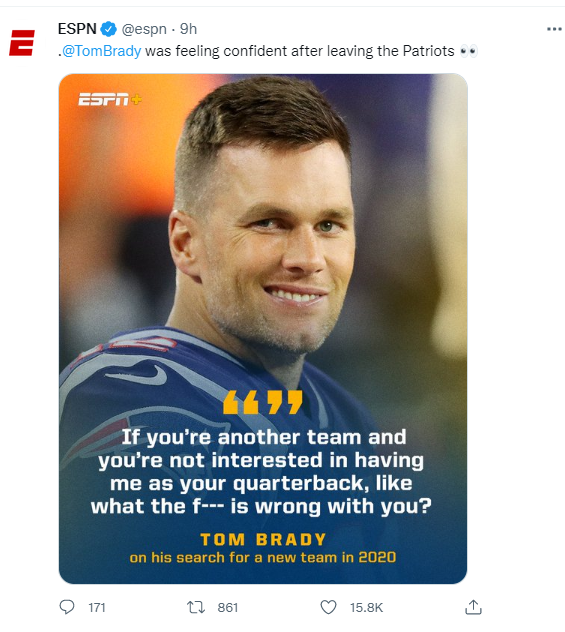 That quote says it all. The NFLs GOAT of Arrogant Pricks. Can’t wait to see him fall flat on his ass this year.