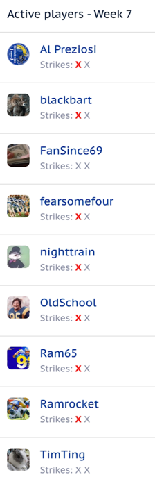 When will Survivor be updated for the NE game? It seems folks that were just eliminated have made picks this week?Congratulations @bomebadeeda @cvramsfan @The Ramowl our week 6 winners, with 10 correct!