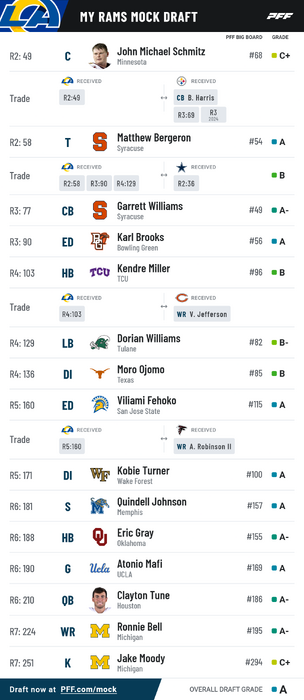 So the Rams can't do that? Suffer a number of losses by starters (6 players) and have a decent draft getting some contributors? We don't have any first round picks but #36 might produce a starter. And then we have 8 picks between where the Chiefs took Cook and Watson. #69, #77, #167, #171, #177, #182, #189, #191. <<<< Hell we've got 6 picks from the bottom of the 5th through the mid 6th (14th pick of the round). And of course we can hope Snead packages one of them with our 2nd or one of our thirds to move down slightly and pick up a 4th round pick, in the vicinity of #108-#122.