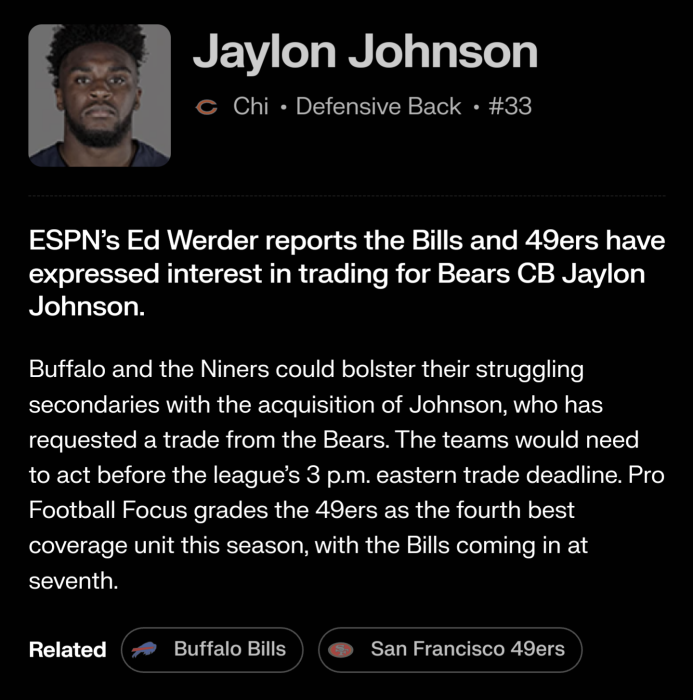 He would def help us, too bad hes prob a rental and prob will go to Bills. 69ers are out of cap next year. Only thing is if Bears eat the money in this trade, which they can do. Wish we did something this deadline at least. Steelers might be able to grab him.