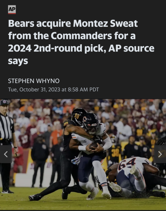 Bears have almost $100M projected cap space in 2024, so Sweat will almost certainly remain in Chicago.