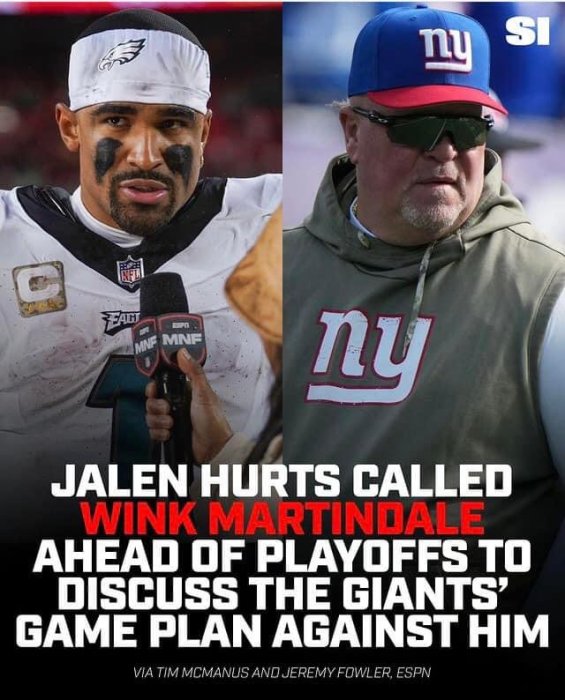 Yeah and also I don't think it's a problem when the DC he's calling isn't the playoff game he's preparing for. No big deal. Wink's an excellent guy to break it down for him I'd think. I'm sure he learned some shit.The controversy in Philly is that Hurts thinks Siriani is a buffoon, which is why he reached put to Martindale to help him better understand what they were doing to him with their blitzing schemes. I believe Martindale was fired or about to be fired by that point anyway. So he wasn't giving away Giant secrets.