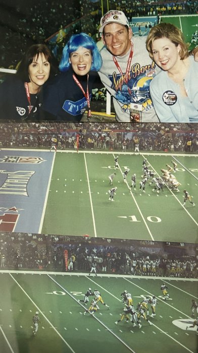 Easily one of the top 5 experiences of my life was being at the game. My sister in-law at the time was with the bank who did a lot of the Titans business, When they beat us in week 7 of the season she consoled me by saying "If we both get to the Superbowl I'll get you a ticket." True to her word, as soon as we beat the Bucs she called me and told me to pack my bags. Her bank got like 75 tickets and she got 4. Great seats too, 2nd section up from the field, row 1 (on the railing) about the 5 yd line. Unfortunatly the final drive ended up at the opposite end of the field. It would've been epic if it would've been at our end!! Ticket price was an insane.....$400