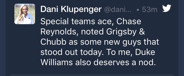 Duke Williams shockingly got a bunch of reps with the 1st team. Someone must really like him. He looks the part. He's a big tall frame with long arms.