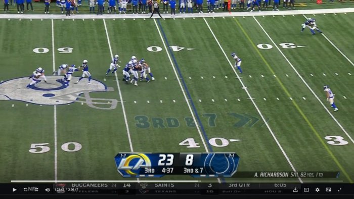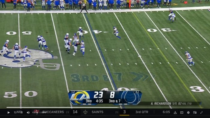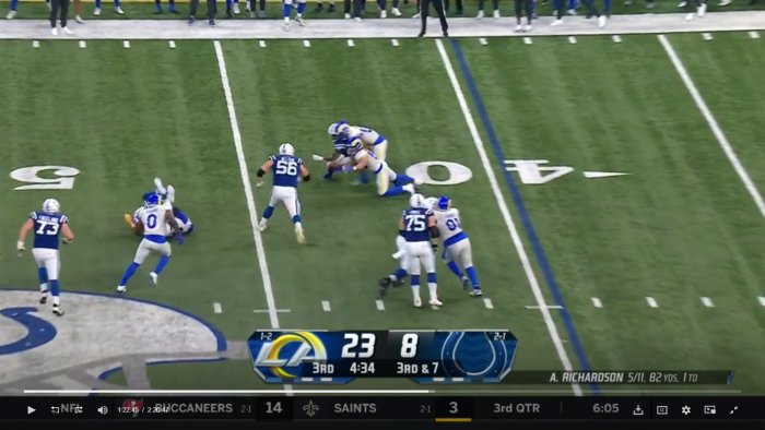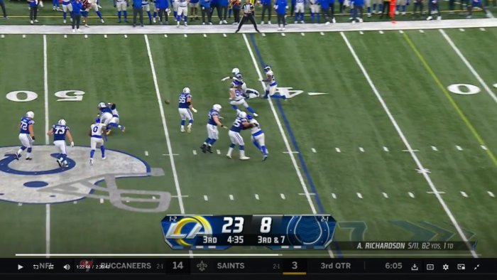 What’s really eye opening is there is not another Ram anywhere near Richardson. One man prevailed even though he is double/triplex teamed regularly.I hated that they took away this momentum changing play by Donald with a penalty on Tomlinson #6. This sequence just goes to show the impact that AD had on the game that didn't show up on the stat sheet.