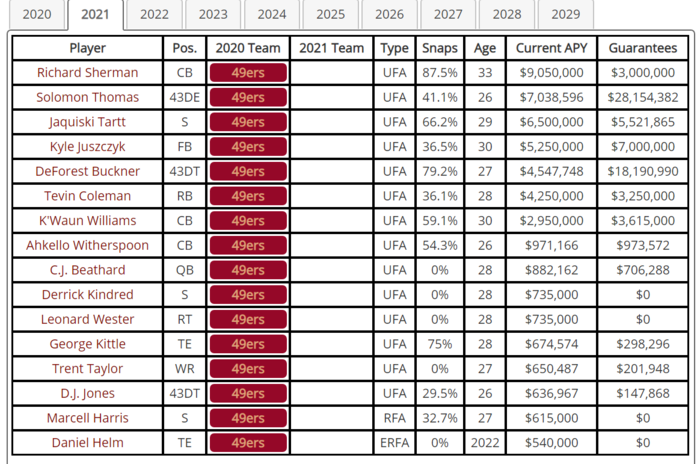 Listing all of the 2023 NFL free agents and free agent contracts of the San Francisco 49ers. Sort free agents by team or positionoverthecap.com