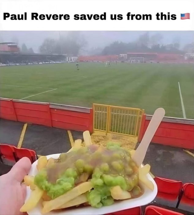 I’m trying to come to grips with the idea of what looks like curry flavored gravy and mashed peas on fries.![]()