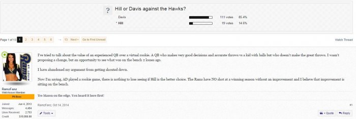 But it is what it is, you'd be preaching to the choir to state that we should see what we have in Hill, or any other quarterback in the system. Because our starter next year is Bradford, and we want the best backup we can get playing behind him, which is not a rookie from the draft regardless of how well rated that quarterback may be.