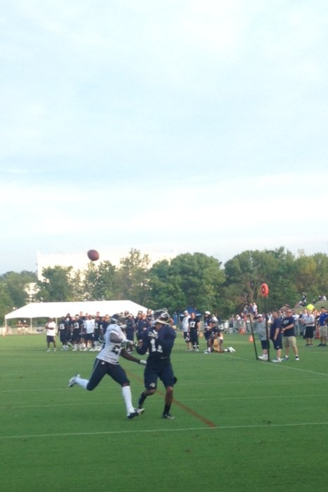 This was the third time I stopped by. I work around the corner, so that makes it easy especially after a long day of sitting in front of a computer. Though it has been said by many, there are a few guys who have definitely stood out. First, Quick looks like a completely different person, and I put A LOT of that on the addition of Britt. Quick is attached to his hip constantly, and I think some of Britt's bravado has rubbed off on him. I also think Austin looks much more comfortable, and is catching almost everything thrown his way. Not only is he making the easy catches, but he is making the kind of catches that makes me think he can be successful lining up on the outside. Also, I believe that Stacy has looked head and shoulders better than the field running the ball, and looks better (not great) in pass pro.