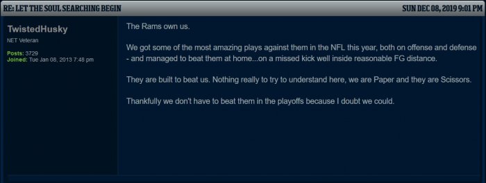 Zero answer for the rams sending pressure every single down. Refused to adapt in the slightest. No roll outs, no quick hitters, no chip/releases, no checkdowns to RB in space. Just pure deep routes against an overmatched offensive line. The final drive needing 16 points in 4 minutes goes 4...www.seahawks.net