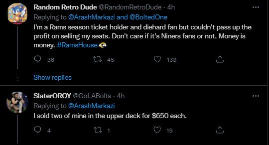 Yea but look at these fake ass fans man. Buy season tickets just to sell them when your team makes it to the NFCC game. Sucks we dont have a legit fanbase yet. I think it will be close to 50/50 again at SoFi which is unfortunate.