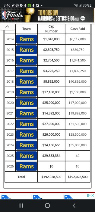One salary year of about $29.3m in 2025 after AD retires. Basically rams will carry an extra QB-sized cap hit that year and the SB window probably closes for a bit.well, there you go. they must have tacked on a couple of huge salary years at the end of his extension as he was only due $15m this year.