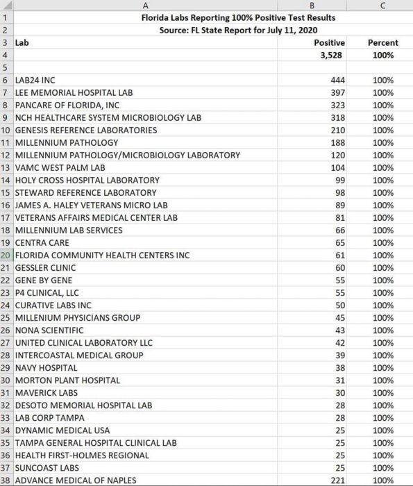 Journalists scouring the reams of daily data for discrepancies have apparently happened upon bombshell they had been hoping for: Orlando Health has just confirmed that some of the data it shared over the weekend were wrong, after journalists reported more than 50 labs showing 100% positivity rate, or roughly around there. One local Fox affiliate looked into the numbers and contacted a few of the labs to confirm that their internal data matched the public data released by the state.