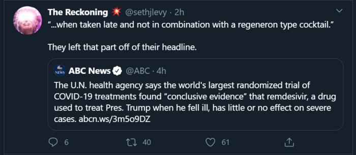 5. Continuing on this theory that "ppl will try to discredit a drug based purely on their political inclinations," then why would ppl waste their time discrediting Remdesivir, since Remdesivir was only mentioned in passing? Regeneron is the new treatment that has been getting a ton of hype, and I have not seen anything like a coordinated smear campaign to discredit it.
