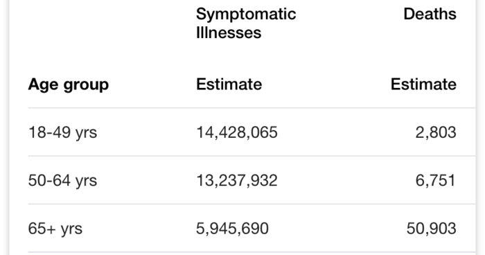 I have to assume that you know that the overwhelming number of people that have died were over 65 yrs of age, and the majority of that number were over 80 yrs of age.
