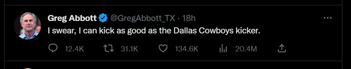 And the Dallas kicker can probably govern as good as Greg Abbott!!!Brutal. And for those who don't know, Gov. Abbott is in a wheelchair, paralyzed from the waist down.