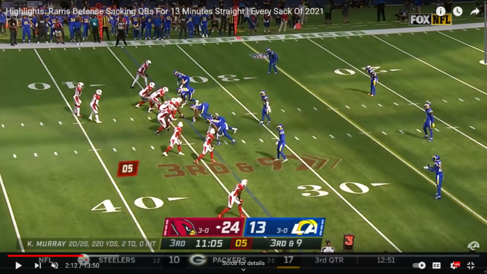So I could only find this 1 play. I don't have NFL+, so I'm left with highlights, I wouldn't have time anyway. This is only sacks, so we're talking a percentage of plays.They did a lot of Fox .... Hoecht plays edge, too, with Young as a DT.