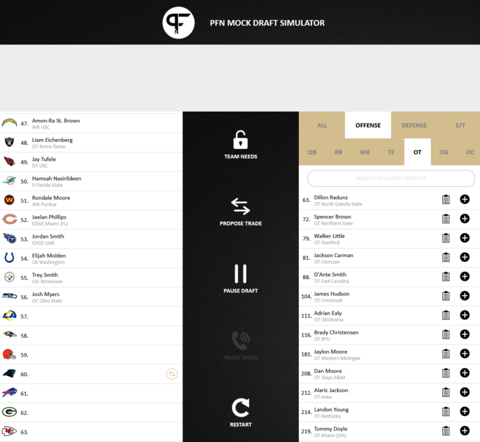 The PFN draft sim had Radunz on the board which floored me. Took him immediately of course as I think Radunz is a slam-dunk round one guy. I think it's more likely Eichenberg is on the board but even in this one he went at 48 which is within the Rams' trade-up range IMO. Either way I gotta say that OT seems every bit as likely as OLB in terms of quality of the guys I'm seeing on average. Just depends if the Rams think he's a blindside type.