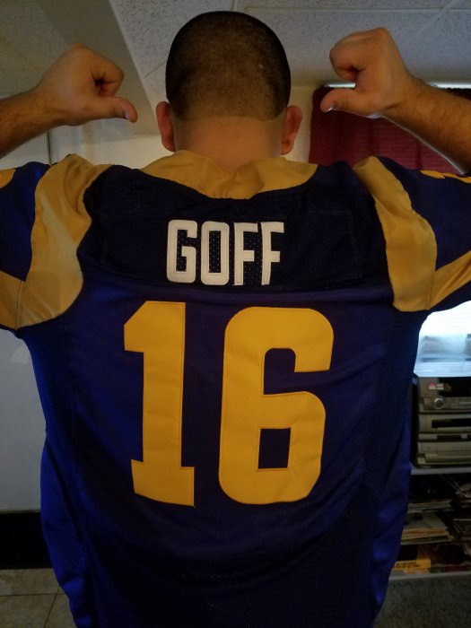 Rams fan David Gardea proudly wearing his No. 16 Jared Goff jersey at today's game in honor of his first NFL start. "I finally get to represent him," Gardea said. "I can't wait. When you get the No. 1 overall pick, you've got to play him." - Eric D. Williams/ESPN Staff Writer