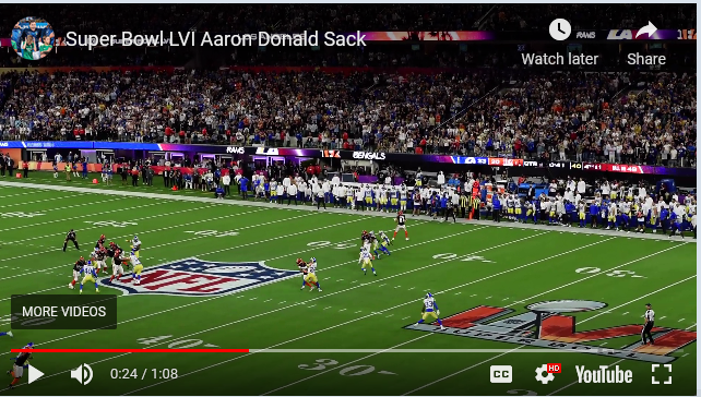 I so wish that Donald had wrapped Burrow up and brought him quietly to the ground instead of grabbing him by the waist and swinging him around giving him the slight chance of making a play. That would have set the record for sacks at 8 which may never be broken and stopped us from having to hold our breath that one last time in that game while giving Michaels a better chance of a more memorable Super Bowl winning worthy call. "The Rams win by a yard"