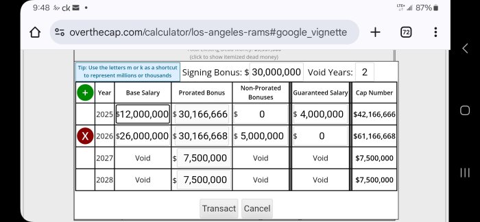Currently, there is $22,666,666 dead cap prorate for '25 and '26. I'm adding a $30m bonus and 2 void years which prorates at an additional $7.5m per year from '25 - '28.