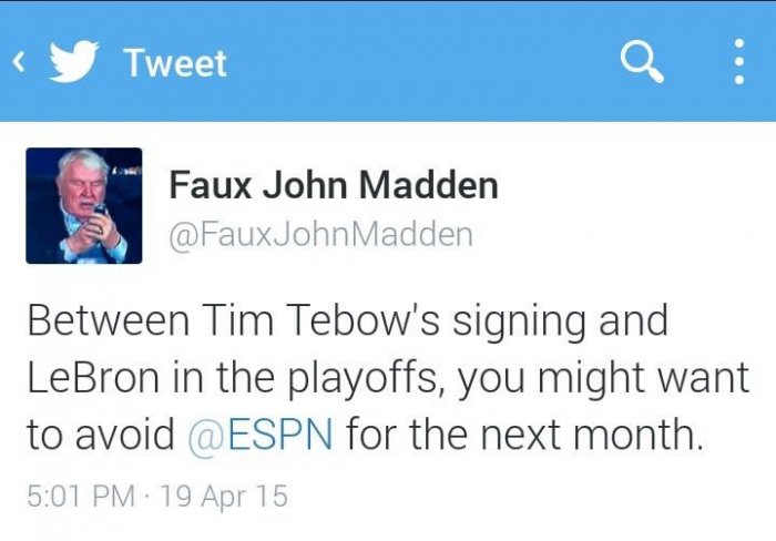 7:46 p.m.: ESPN’s Darren Rovell tweets, “98,000 Tweets on Tim Tebow in last hour.”