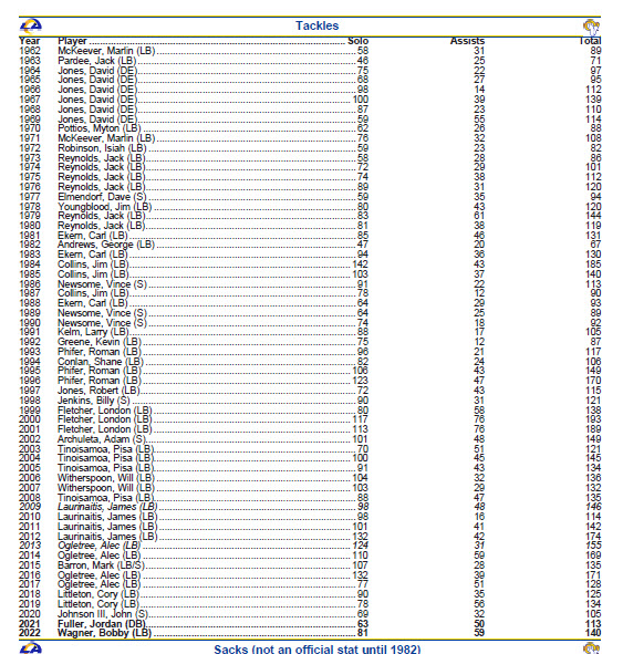 Yeah, you have to wonder where the media team is getting their stats, or how they're counting. NFL.com no longer seems to keep stats on retired players, and I couldn't find tackles for Jim Collins but looking at some of the more recent names on this list and comparing it to espn and pro football reference they're not close.According to their own stat sheet.