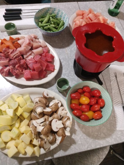 So starting at the meat plate, we have prime ribeye, fresh sockeye salmon, sword fish, ago. Next we have a bowl of sugar snap peas. After that we have semi-green watermelon, ripe banana, and avocado. Next, a bowl of cherry tomatoes. After that, a plate of rutabagas, crimini mushrooms, and summer squash. The broth is a beef Pho with some Tom Yum base added. And... A little Soju.View attachment 39200