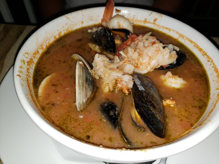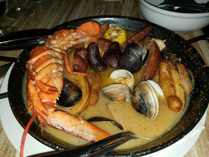 I had a New England clam bake and the wife had Cioppino. The liquid/soup in these look similar.... but they were completely different. There was a big smoked sausage in mine that you can't see. They had to wheel us out to our car we were so full.