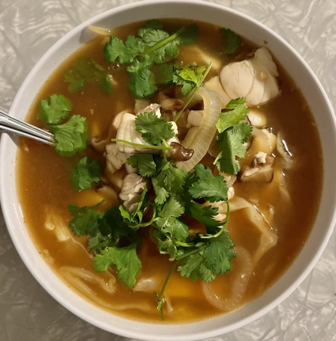 Barramundi rice soup. This was REALLY good. The key is to rinse your jasmine rice several times before adding it to the broth and don't overcook the fish. If anyone is interested, I'll do a detail on how to make this dish.