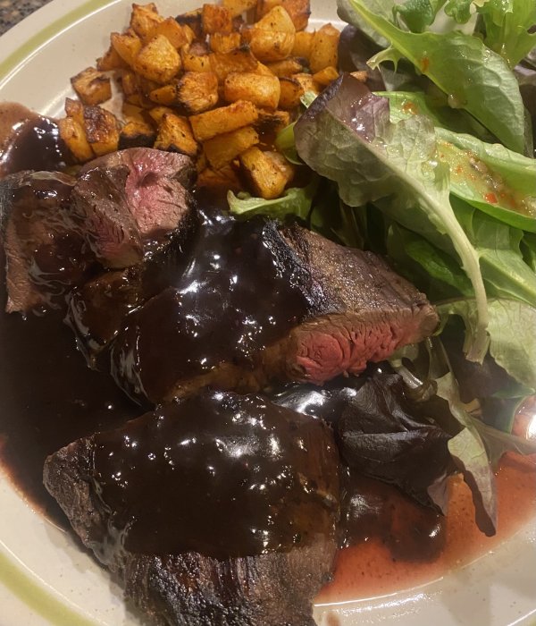 OK … That’s it!Mule deer tenderloins with red wine and blackberry reduction. Salad and turnips from our garden.