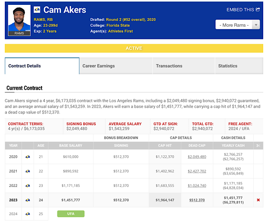 Spotrac has Akers as UFA in 2024.