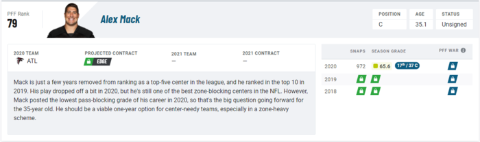 IMO, Jon Feliciano is more likely in our price range, and I'd love for us to sign him. He can play any of the interior OL positions. He has played C and LG this year. He started every game last year for them at RG. He's 6'4" 325 pounds with a serious mean streak. The Bills signed him (and a couple others) after 2018 to help solidify that OL, and he has lived up to his contract. That's a dude who isn't getting blown off the ball at Center. And this article speaks glowingly about his work and film habits, communication skills, and leadership: