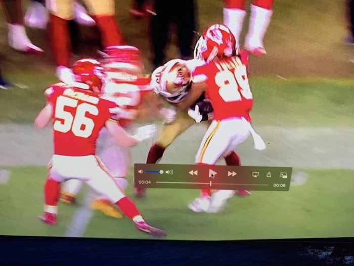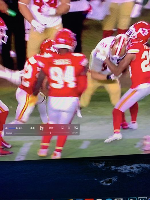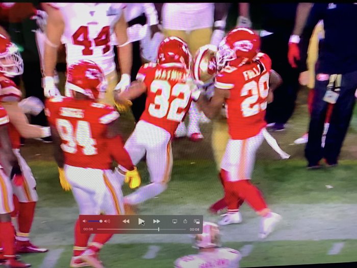 Here's the play I'm talking about. It's the Honey Badger hitting Kittle once he's out of bounds. Quick...yeah... but I've seen less called. I’m a tech idiot and can’t upload the video so I tried to do a series of stills. Kittle gets knocked out of bounds by Fuller and Mathieu. Mathieu then releases him, squares up and lunges at him while being well out of bounds.