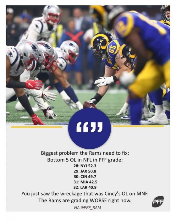 <blockquote class="twitter-tweet"><p lang="en" dir="ltr">Biggest problem the Rams need to fix:<br><br>Bottom 5 OL in NFL in PFF grade:<br>28: NYJ 52.3<br>29: JAX 50.8<br>30: CIN 49.7<br>31: MIA 42.5<br>32: LAR 40.9<br><br>You just saw the wreckage that was Cincy&#39;s OL on MNF. The Rams are grading WORSE right now.</p>&mdash; Sam Monson (@PFF_Sam) <a href="