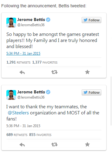 “I want to thank Steelers fans who have been amazing throughout this whole process,’’ Bettis said, “and the love I was shown from the first day I was traded to Pittsburgh until the day I retired with a championship in Detroit. Steelers fans have been the best fans in the world to me.”