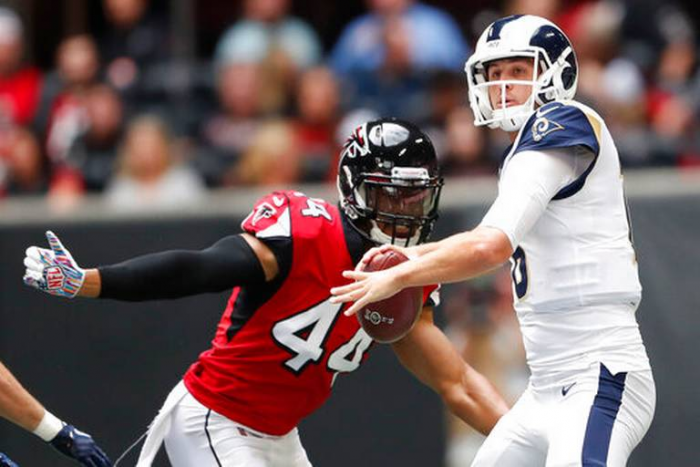 Bottled up the week before in an ugly home loss to San Francisco, Goff passed for 268 yards and a pair of touchdowns to running back Todd Gurley and tight end Gerald Everett. His fun-reel highlight, faking out linebacker Deion Jones, came on a 1-yard touchdown run. Goff spiked the ball for effect.
