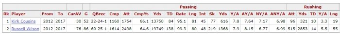 I know. I'm not saying he's a crappy QB or anything. There is a significant decision to be made if you're starting a team though. Do you want a zone-read offense, or a WCO? If I had to rank the two, I'd say Wilson is the better all-around QB, but I think Cousins is a better thrower. Their comparison breakdown is pretty telling in that it solidifies the idea that scrambling QBs tend to get sacked WAY more than traditional pocket passers.