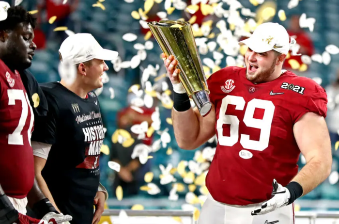 At 6-foot-6, 333 pounds, Dickerson is a former guard who won the Rimington Trophy as the nation’s top center after helping the Crimson Tide to the national championship as a junior in 2020.