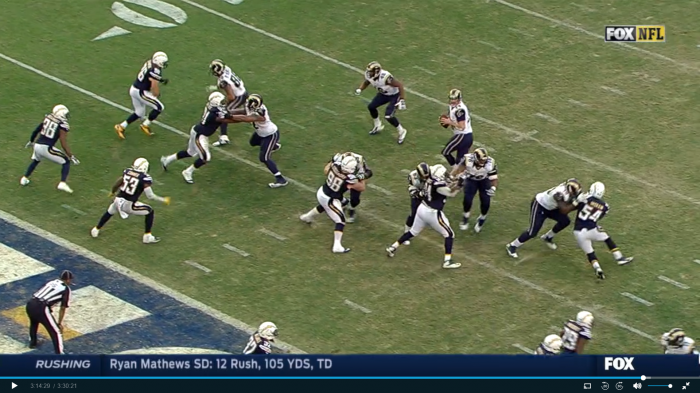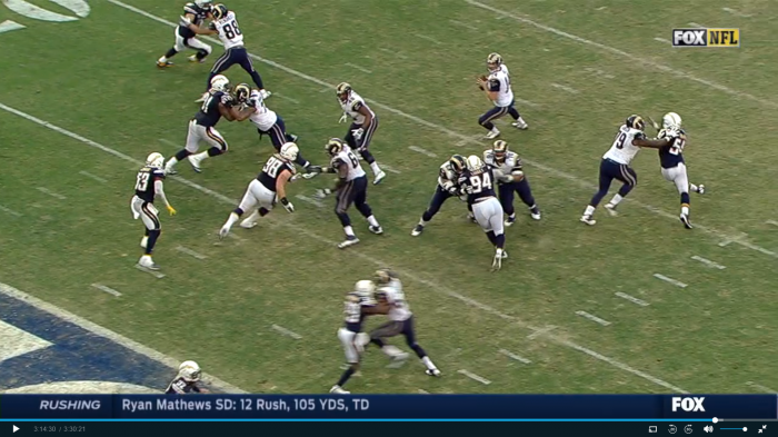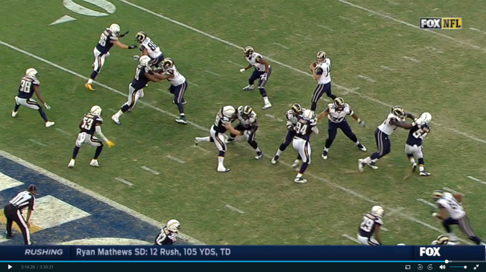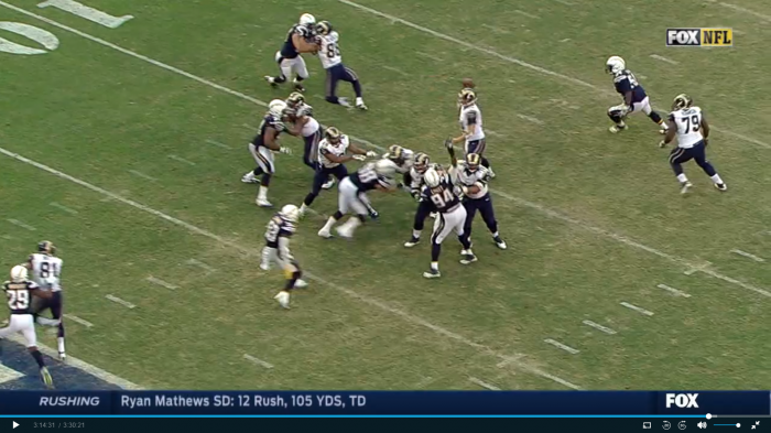 A few more screen prints, this is where Wright first contacted Britt on the left hash, note the extended arms across the front of Britt's chest. Bump step 1, Britt about to put down his right foot.