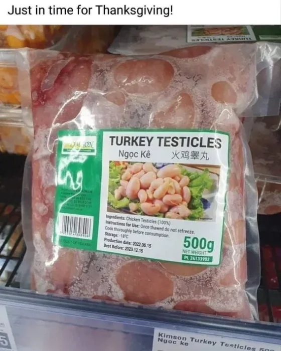 Funny that the ingredients say 100% chicken testicles.