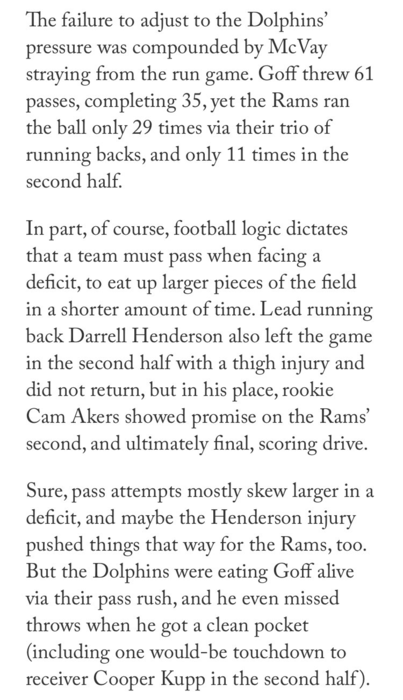 I don't have a subscription to The Athletic, but Jourdan was kind enough to post a couple of stills from her post-game piece on her twitter feed, which I've posted below. These are Spot. Fucking. On. McVay was positively Martz-ian today, and that to me is the number one reason we lost. Not excusing Goff, not excusing the pass blocking ... but McVay could have made that moot. He didn't.