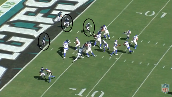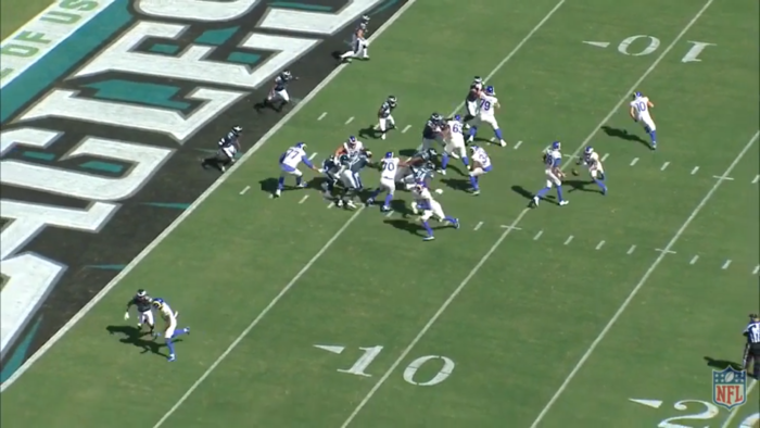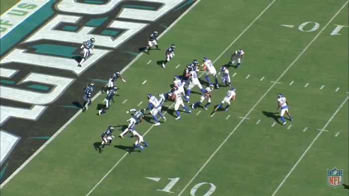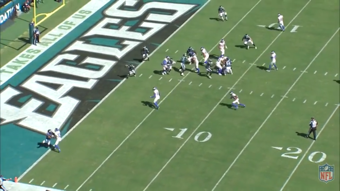 And now the coup de grace with the flip of the ball to Woody. Now people won't be impressed by this but look at his body language. Look where Goff's hands are. And note the position of the LBs with the nearest one at the left hash.