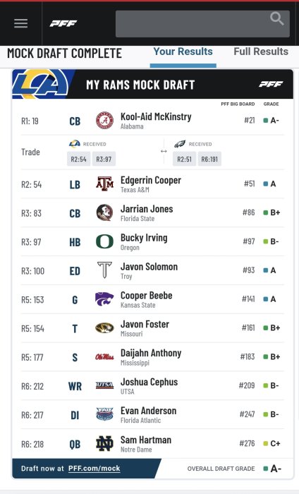 I hate when mocks include trades. Sure they're gonna happen but most occur in the lower rounds (3-7).