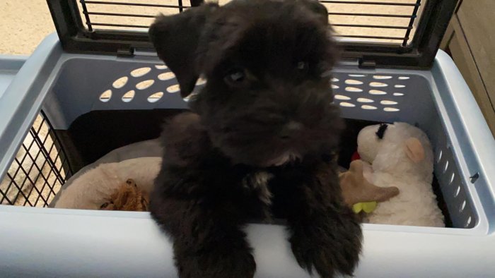 It took them a while to find the right breeder and of course then wait for a litter with the pup that met their wants. So yesterday they drove up to Jacksonville and brought home Cali. She's a schnauzer.