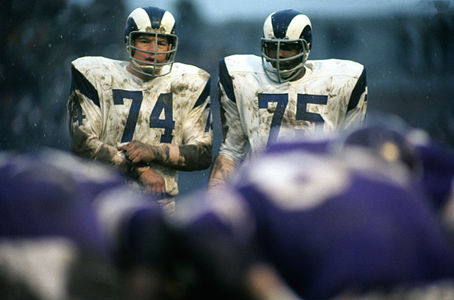 One of those is also a key moment in football history, period. That came in 1948, after the Rams' second season of their first stint in L.A. Halfback Fred Gehrke, who had studied art at the University of Utah, convinced coach Bob Snyder and owner Dan Reeves to let him paint ram horns on the team's headgear -- the first graphic ever to appear on an NFL helmet (further info here):